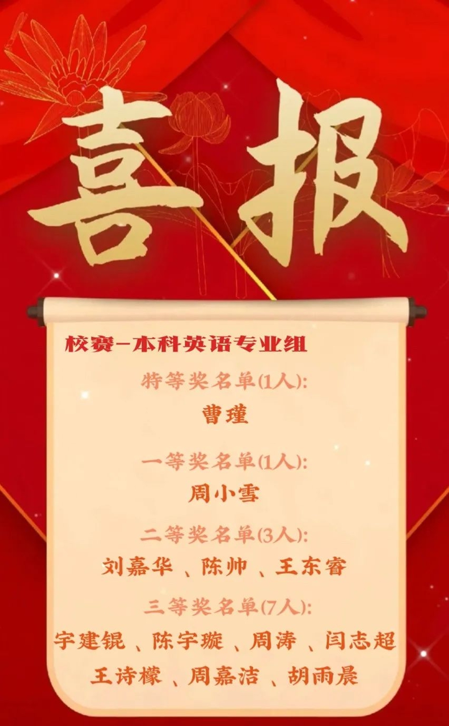 近日,外教社发布了第三届“外教社·词达人杯”全国大学生英语词汇能力大赛获奖名单。我校学生斩获多个奖项。其中我校学生吴玥荣获省级一等奖,李晓娜、弓静莎、曹舒爱荣获省级二等奖,李想荣获省级三等奖,曹瑾荣获校级特等奖。