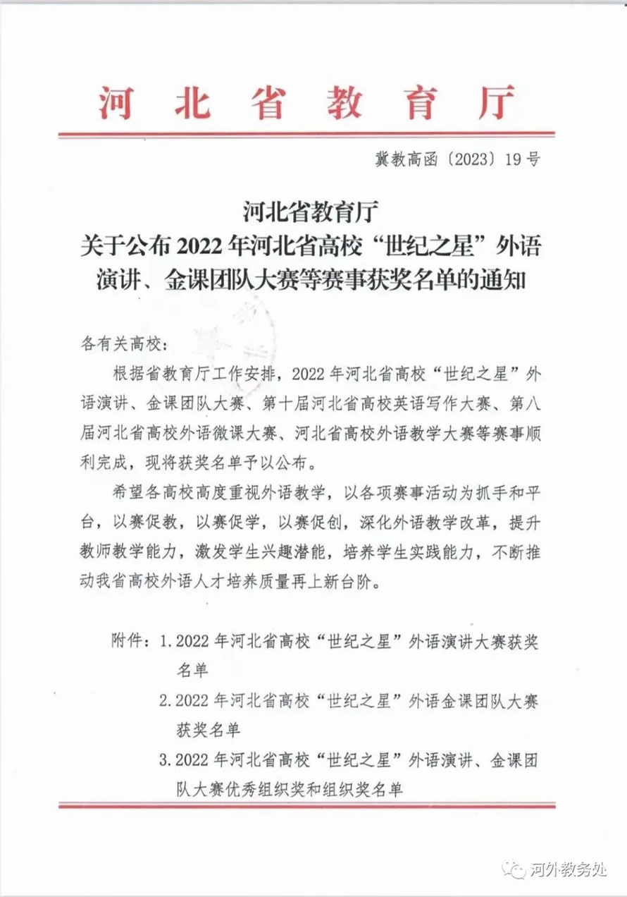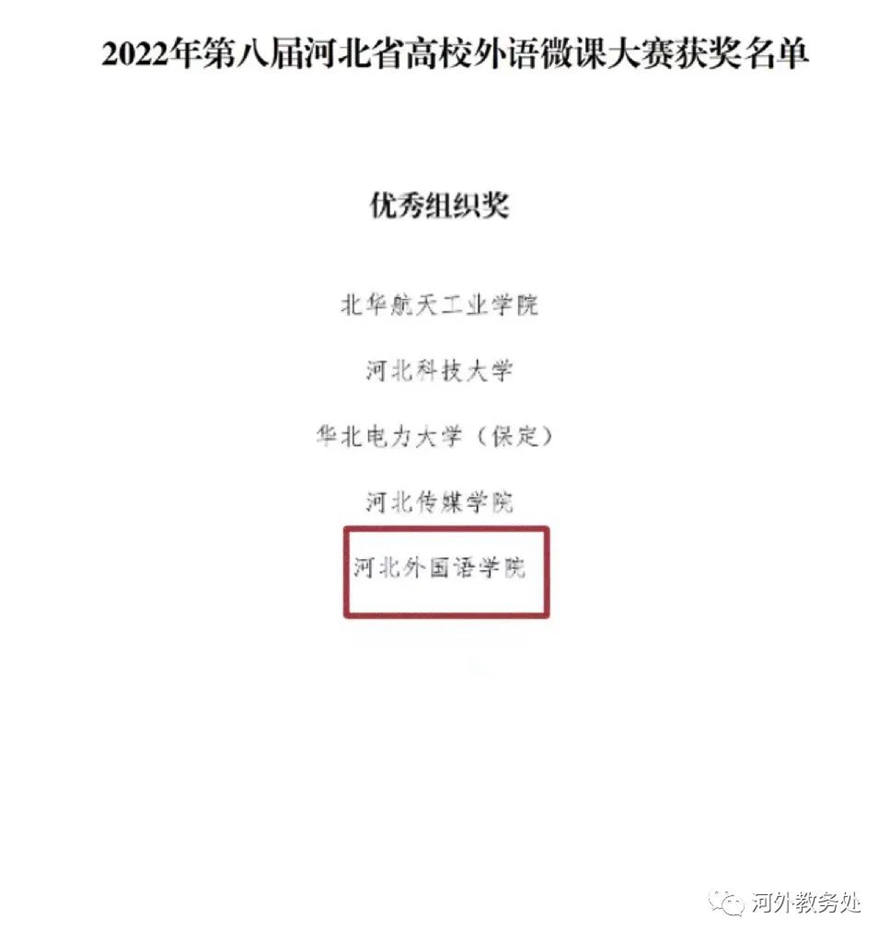 近日,河北省教育厅发布了《关于公布2022年河北省高校“世纪之星”外语演讲、金课团队大赛等赛事获奖名单的通知》冀教高函(2023)19号,河北外国语学院师生斩获多项比赛荣誉,其中我校刘高兴老师为第一负责人的教学团队荣获“河北省高校外语微课大赛一等奖”!