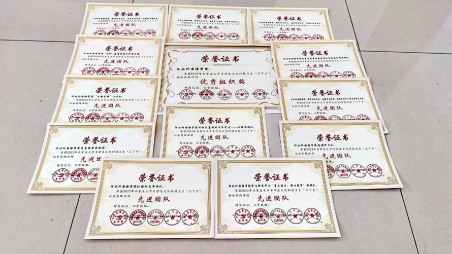 近日,中共石家庄市委宣传部、石家庄市精神文明建设委员会办公室、共青团石家庄市委、石家庄市教育局、石家庄市学生联合会下发2022年石家庄市大中专学生志愿者暑期文化科学卫生“三下乡”社会实践活动先进团队荣誉证书,授予河北外国语学院“三下乡”社会实践活动优秀组织奖,授予河北外国语学院12个团队“先进团队”称号。