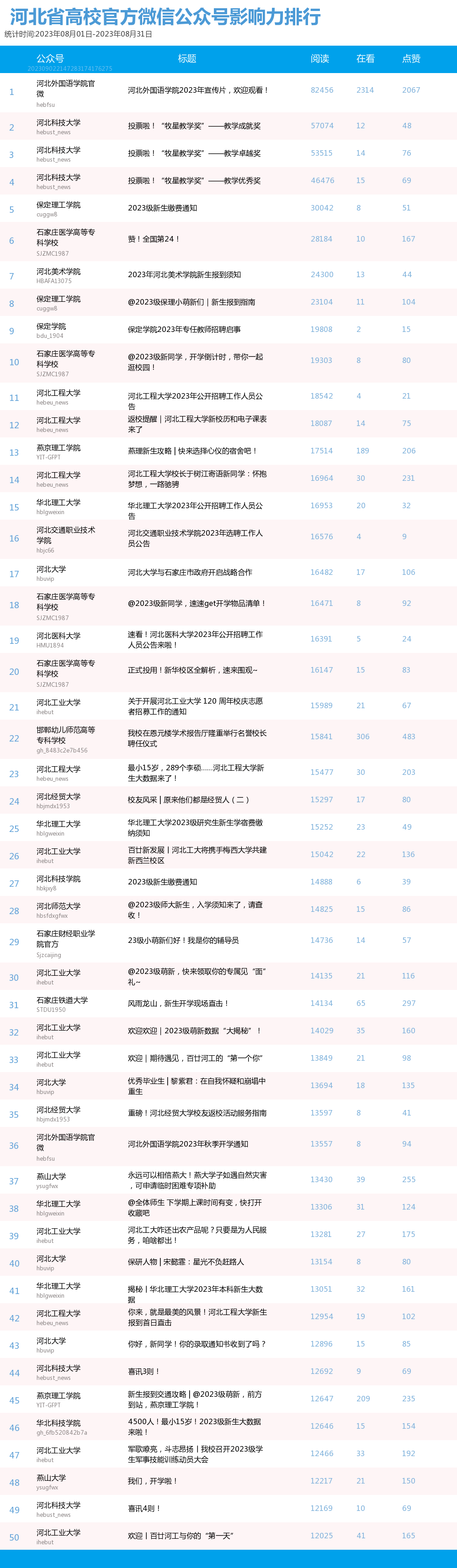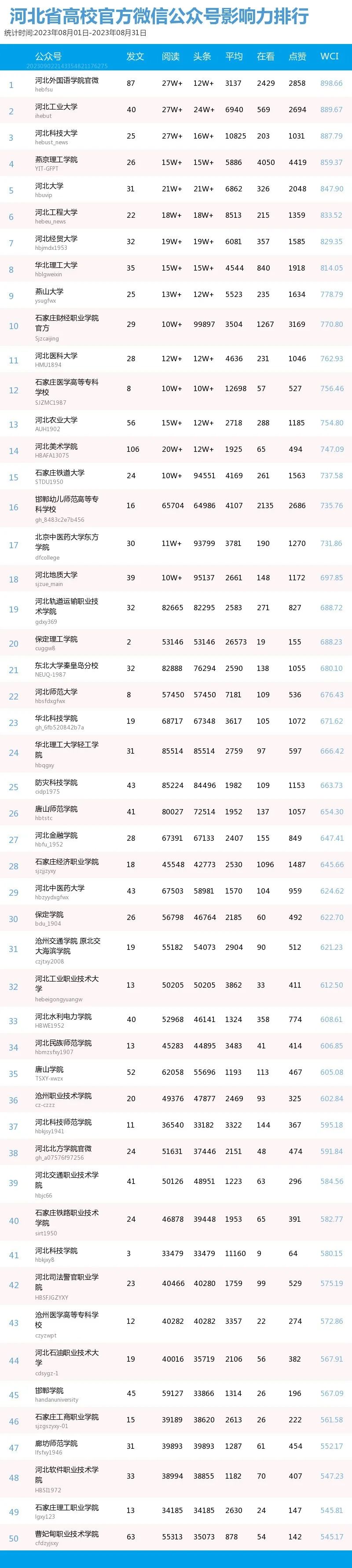9月3日,“冀网育”公布河北省高校官方微信公众号影响力排行(2023.08.01-2023.08.31),河北外国语学院官微8月份在河北省高校官方微信公众号影响力排行榜中,以898.66的WCI指数夺得榜首位置。8月,河北省高校官方微信公众号月度热文TOP50中,@河北外国语学院官微的《河北外国语学院2023年宣传片,欢迎观看!》夺得首位。