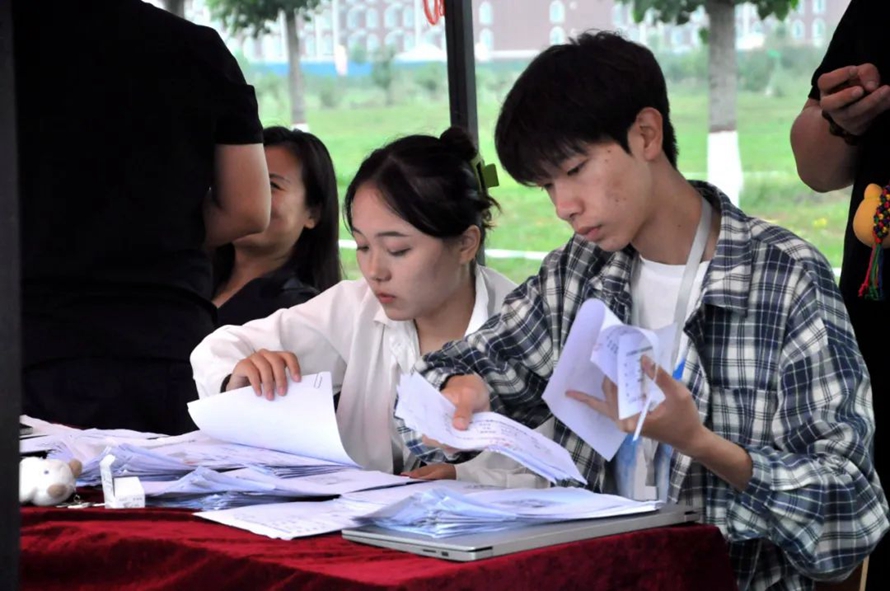 迎新棚下,各二级学院辅导员老师亲自上阵,行政院长也纷纷来到现场,登记信息、发放物资,一点也不含糊,丝毫没有当领导的架子,他们是河北外国语学院最亲切的人民教师,也是河北外国语学院师生最贴心的家人。