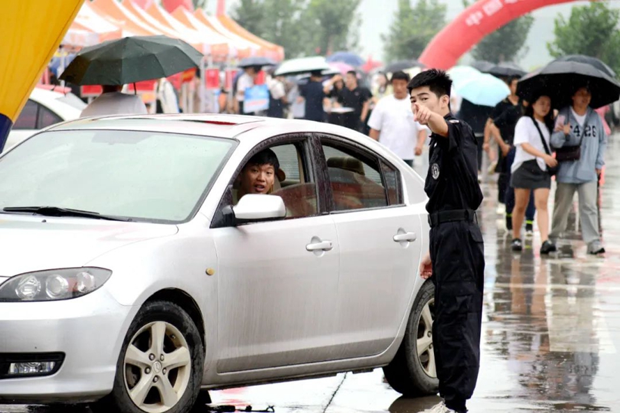 “请各位新生及家长有序到棚下避雨,我们会安排车辆送你们去公寓办理入住。”考虑周到的各二级学院迎新队伍,纷纷在迎新棚旁边立起了几顶新篷,安排新生及家长在棚内等待。