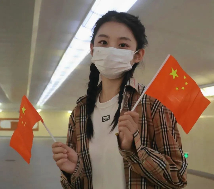还有很多和国旗的合影看了都会忍不住点赞。有的在脸上画上了国旗、有的向国旗敬礼,还有的利用手机做道具......