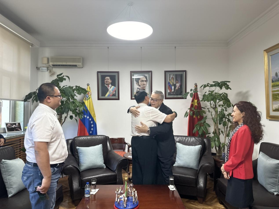 2023年国庆佳节到来之际,河北外国语学院董事长、校长孙建忠院士率团一行访问委内瑞拉驻华大使馆,委内瑞拉驻华特命全权大使朱塞佩·约夫雷达与使馆主要外交官在大使馆门口迎接。孙建忠校长与朱塞佩·约夫雷达大使相拥问候。