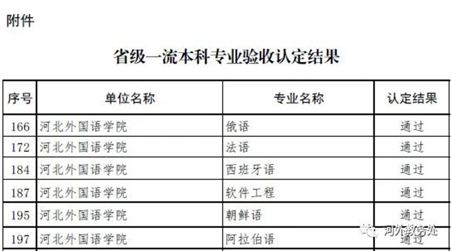 近日,河北省教育厅印发《河北省教育厅关于公布省级一流专业验收认定结果的通知》(冀教高函〔2023〕59号),公布了2019年度立项建设的213个省级一流本科专业验收认定结果,河北外国语学院提交验收的俄语、法语、西班牙语、软件工程、朝鲜语、阿拉伯语6个专业均通过验收,顺利列入省级一流本科专业。