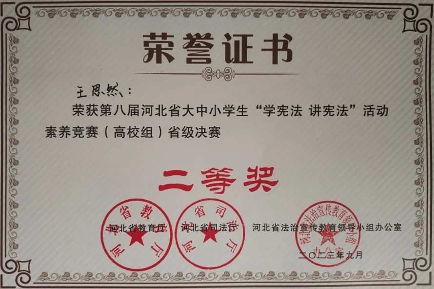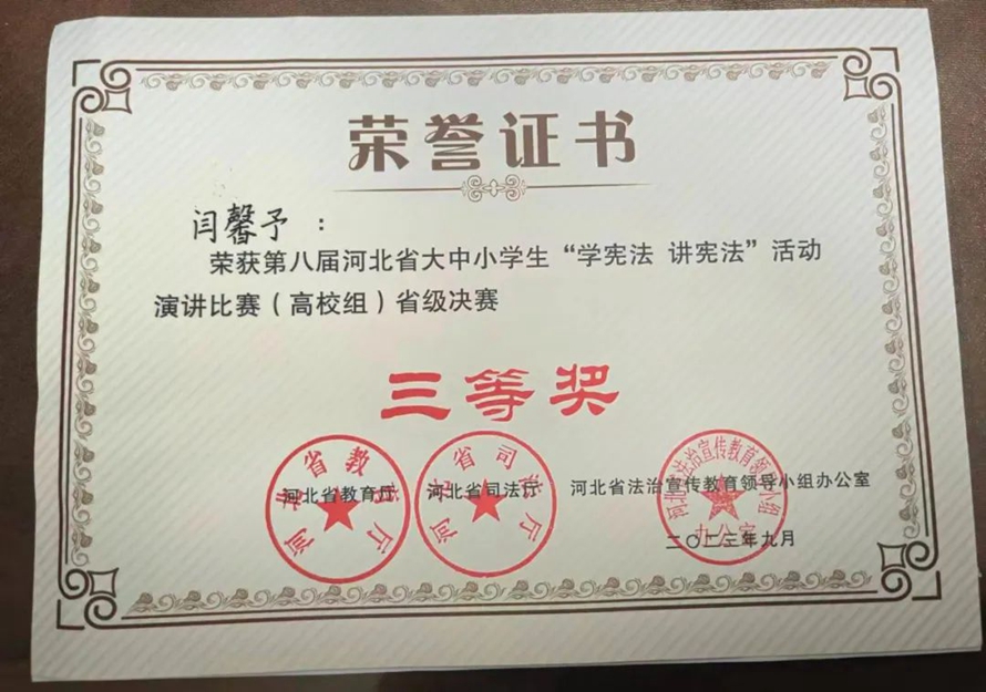 在演讲比赛,闫馨予以《沐浴宪法之光,体悟时代脉搏》为题,将宪法比喻为“紧身衣”与“防身衣”,将宪法赋予公民的权利与义务相统一,总结出“学法是为了明辨是非,知法是为了明荣辱,守法是为了正社风,用法是为了止纷争”的结论。最后,闫馨予呼吁青年要践行宪法,热爱宪法,沐浴在宪法之光下,体悟时代的脉搏。经过河北省高校64名演讲选手激烈角逐,闫馨予获得素养竞赛(高校组)省级决赛三等奖。