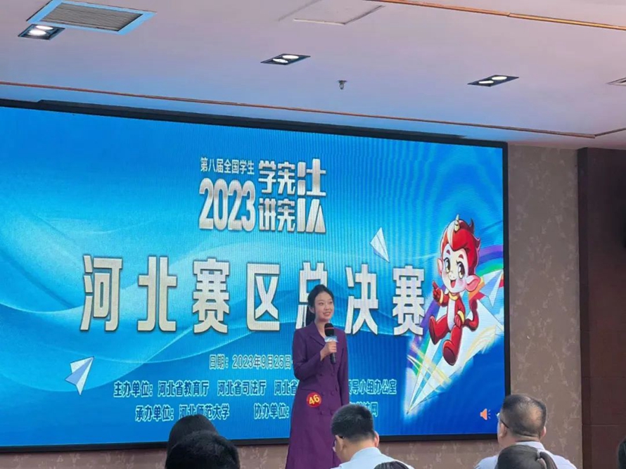 9月26日至27日,由省教育厅、省司法厅、省法治宣传教育领导小组办公室主办,河北师范大学承办的第八届河北省大中小学生“学宪法 讲宪法”大赛暨全国选拔赛在石家庄观和国际酒店顺利举行!河北外国语学院国际商学院21级国际经贸规则本科班王思然、传媒学院22级播音与主持艺术1班闫馨予分别获得素养竞赛(高校组)省级决赛二等奖和演讲比赛(高校组)省赛决赛三等奖。黄晓敏、王建梅两位教师对本次比赛进行了全程、全方位指导。