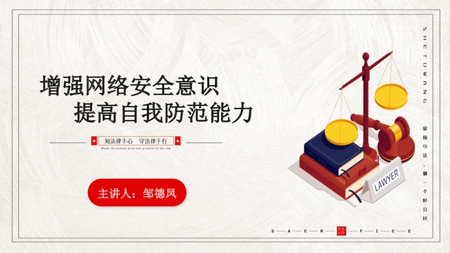 本次普法讲座以“增强网络安全意识 提高自我防范能力”为主题,从网络数据的概念,数据安全的主要问题及法律规定,网络犯罪的概念、常见形式及防范措施三个方面为我们普及了有关网络安全的法律知识。