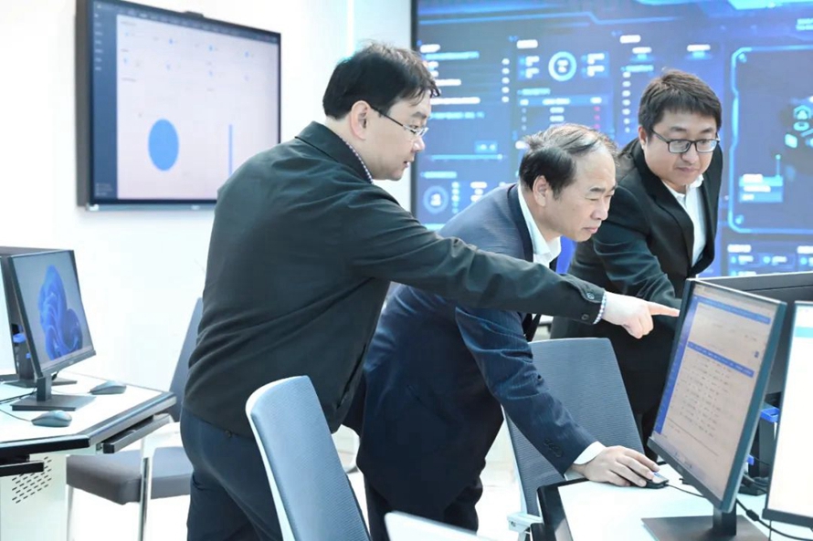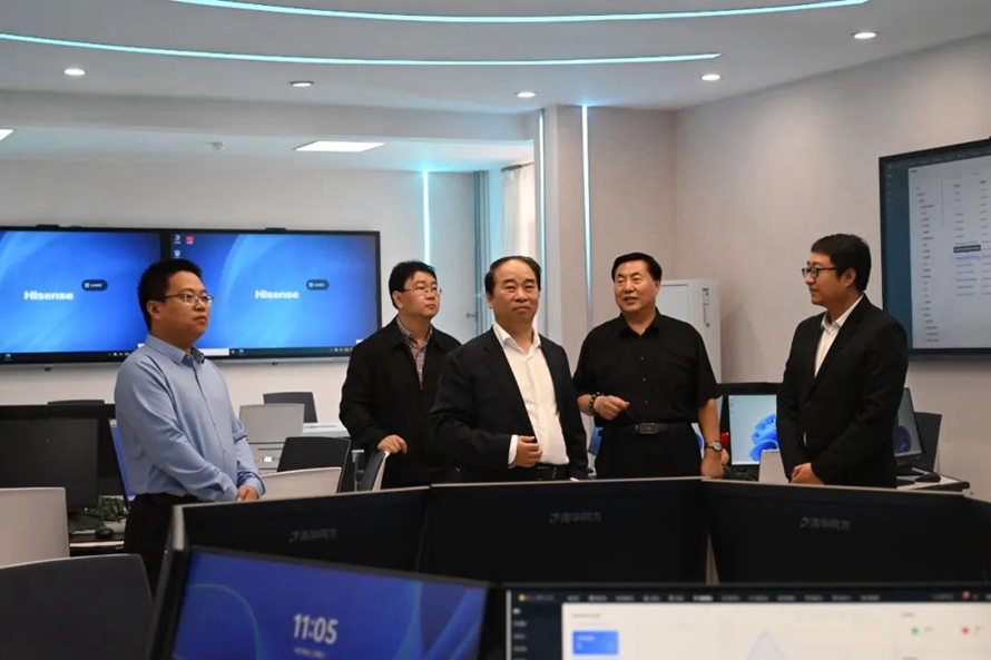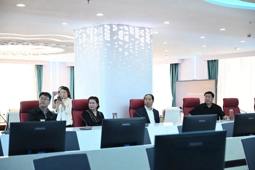 在孙校长的陪同下,王定华书记一行参观了学校智慧大脑、大数据中心、管理决策舱,以及各专业实训室、各语种情境实训室。