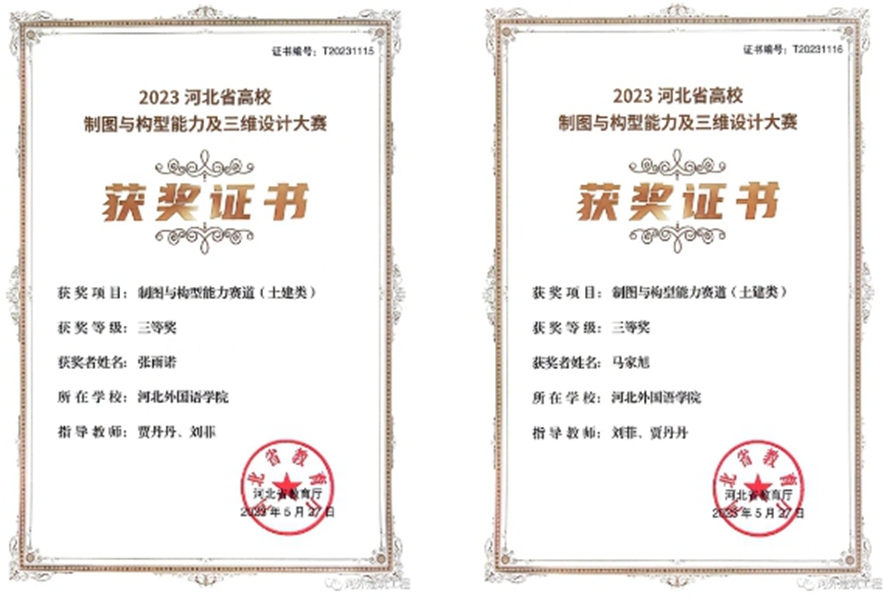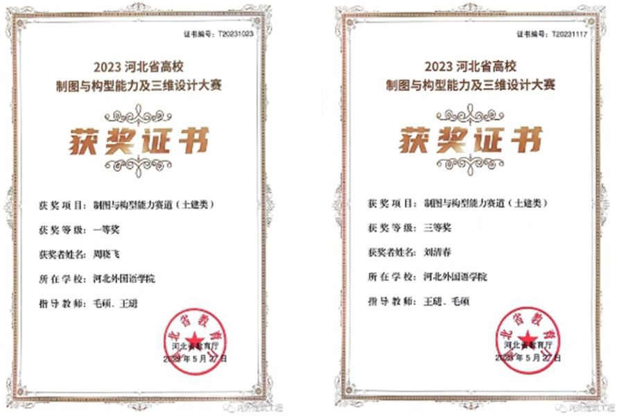 河北外国语学院涉外建筑工程学院积极推进学校“以赛促学、以赛促教、以赛促改、以赛促建”教学教育模式,组织指导学生参加2023年河北省高校制图及三维设计大赛制图与构型能力赛道,突破土建类专业获奖记录,一等奖1项,三等奖3项,学生在比赛中展现出高素养、高技能的状态,付出总有收获,为下一阶段参加国赛与三维设计比赛奠定基础。