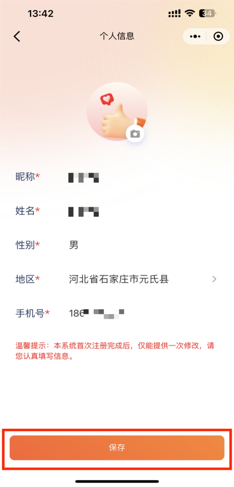 3.点击“个人信息”填写注册信息,地区选择元氏县,填写完毕后点击“保存”完成注册。