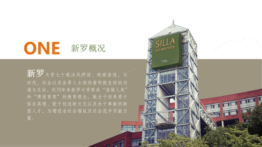 韩国新罗大学(Silla University),简称“新罗大”,创建于1954年,是一所以传统和历史闻名的名门私立大学。学校坐落于韩国第二大城市、第一大港口城市——釜山。1997年,校名由“釜山女子大学校”变更为“新罗大学校”。新罗大学校现下设7个单科学院和4个研究生院,共开设有60多个专业,在校本科生及研究生共计11,000多名。被选为“韩国十大风景校园”;“韩国四大绿色教育机关”;“韩国八大韩国语教育院”之一。