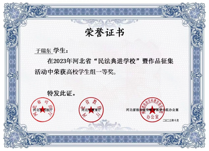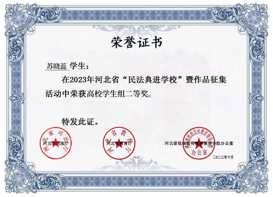 河北外国语学院国际语言教育学院苏晓蕊同学在2023年河北省“民法典进学校”暨作品征集活动中荣获高校学生组二等奖。