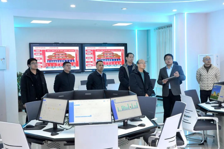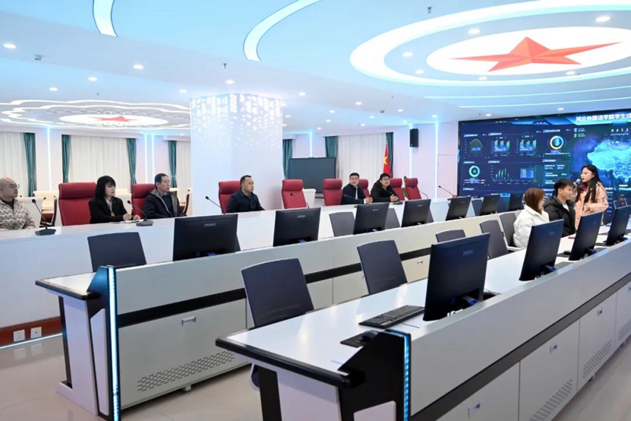 石家庄市科技局柯旭副局长一行先后参观了河北外国语学院校史馆、新校区沙盘、智慧大脑、大数据中心、管理决策舱等地点,重点了解了河北省国际科技园区建设情况,详细询问了多家入驻企业的产教学研融合方式、创业孵化项目以及公司运营管理情况。