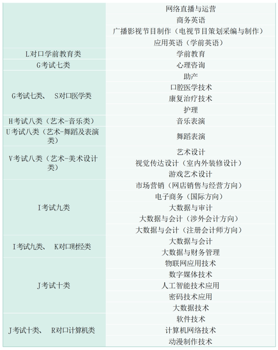 答:面向普通高中生的考试类:考试一类、二类、三类、五类、六类、 七类、八类、九类、十类;面对中职毕业生的专业类:建筑类、旅游 类、电子电工类、学前教育类、医学类、财经类、计算机类均有相关 专业的招生。具体招生专业如下表: