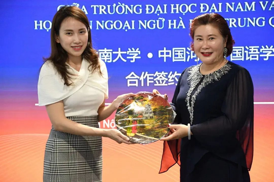 大南大学国际处长黎氏梅芳向河北外国语学院副董事长、执行校长习伟教授赠送礼物