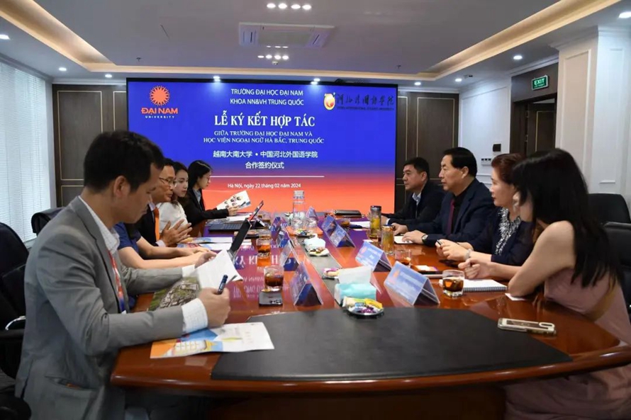 河北外国语学院与越南大南大学校长范文宏、国际处黎氏梅芳、中国语言和文化交流系主任武氏明河等领导交流座谈