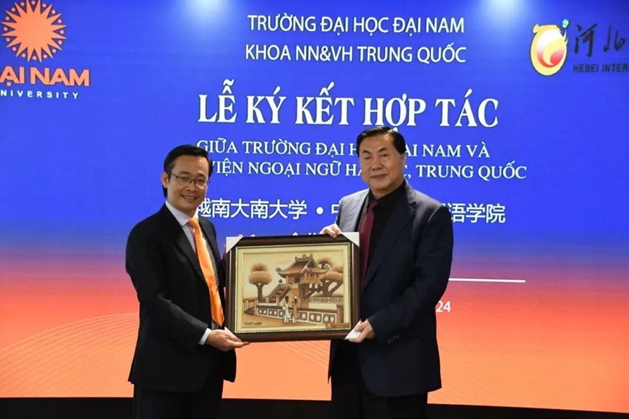越南大南大学范文宏向河北外国语学院董事长校长孙建忠院士赠送礼物