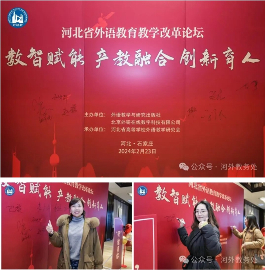 2024年2月23-24日,河北省外语教育教学改革论坛在石家庄召开,会议围绕“数智赋能·产教融合·创新育人”的主题而开展,出席本次会议的领导有河北省教育厅高等教育处一级调研员高明,河北省高等学校外语教育研究会会长李正栓教授等。河北外国语学院教务处李超处长和质监办巴黎处长参加本次会议。