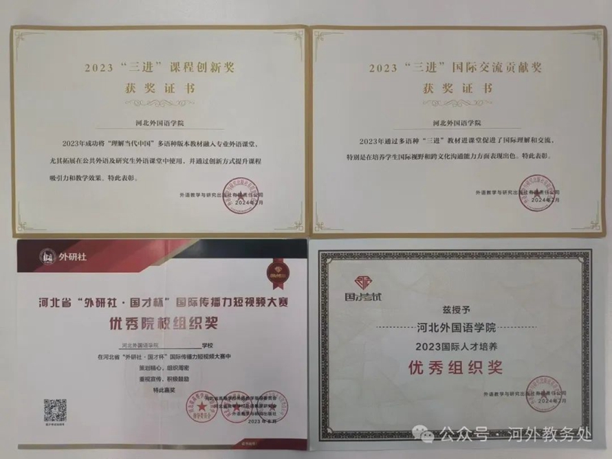 河北外国语学院在2023年高等外语教学改革中收获颇丰,本次大会中荣获四项奖项,分别是2023“三进”课程创新奖、2023“三进”国际交流贡献奖、河北省“外研社·国才杯”国际传播力短视频大赛优秀院校组织奖、2023国际人才培养优秀组织奖。