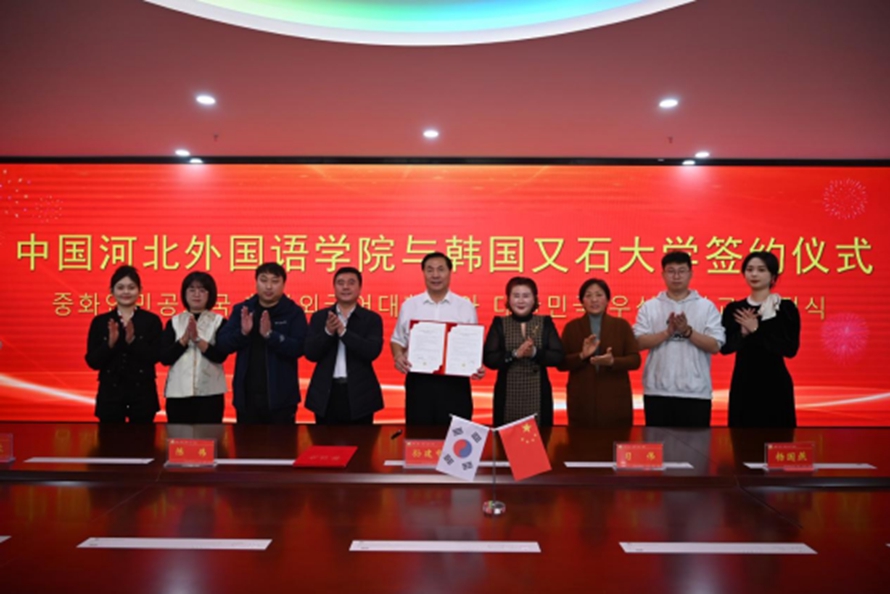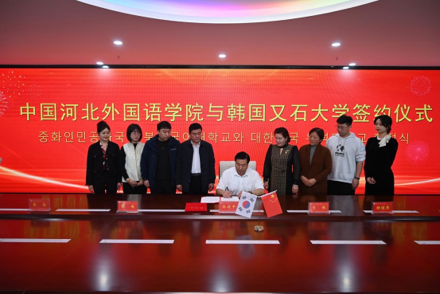 2024年3月11日,河北外国语学院与韩国又石大学正式签约。河北外国语学院董事长、校长孙建忠院士在合作协议书上正式签字,学校副董事长、执行校长习伟,外事副校长陈伟,校委委员杨国燕,东方语言学院院长李航等领导、老师见证签约。