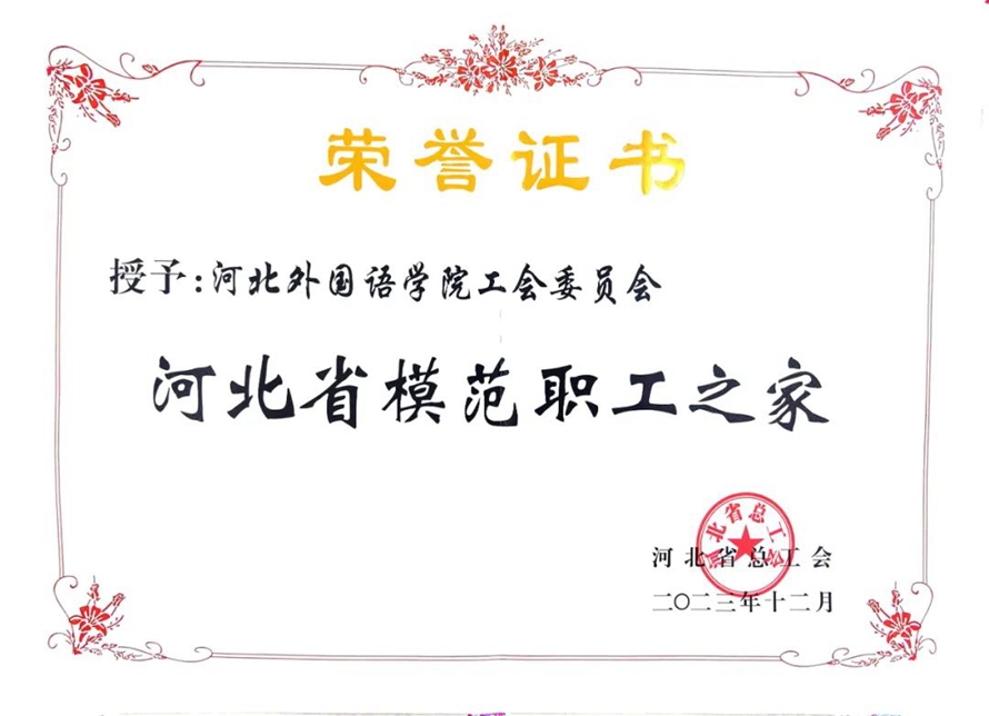 近日,为进一步激励和引导广大基层工会组织和工会干部建功新时代,河北省总工会发布《关于表彰省模范职工之家、省模范职工小家、省优秀工会工作者的举动》文件,授予河北外国语学院工会委员会“河北省模范职工之家”称号。