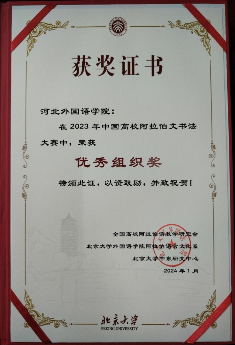 2023年中国高校阿拉伯文书法大赛圆满结束。河北外国语学院荣获此次大赛优秀组织奖,学校2022级阿拉伯语专业刘佳林同学荣获高校组三等奖。