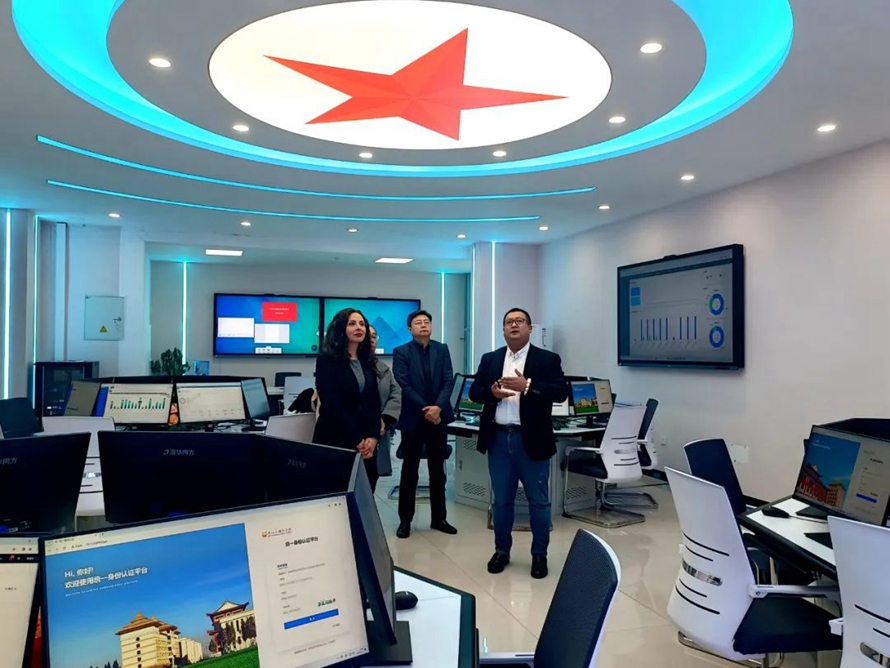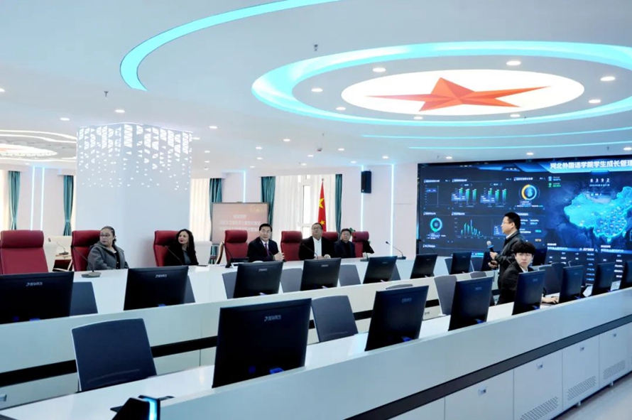 代表团一行参观了河北外国语学院智慧大脑、大数据中心、管理决策舱,并通过监控设备观看了各专业实训室等基础设施,观看了河北外国语学院西班牙语版宣传片。孙校长向代表团一行详细介绍了校区各功能区及未来发展。