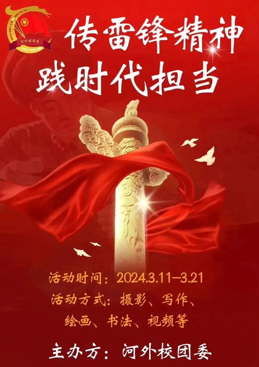 2024年3月11日—21日,河北外国语学院校团委举办了“传雷锋精神,践时代担当”学习展示活动。学生围绕主题创作视频、文学、绘画、书法、摄影等作品。