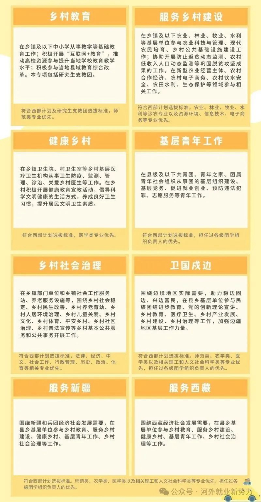 2024—2025年度,由中央财政支持,面向普通高等学校(教育部《全国普通高校名单》所列高校)应届毕业生或在读研究生,按照公开招募、自愿报名、组织选拔、集中派遣的方式,招募选派西部计划全国项目志愿者到西部地区基层工作(含已招募的第二十六届中国青年志愿者扶贫接力计划研究生支教团志愿者)。各地参照全国项目的运行模式和工作要求,组织实施西部计划地方项目。西部计划全国项目和地方项目均可通过西部计划官方网站(http://xibu.youth.cn)报名。