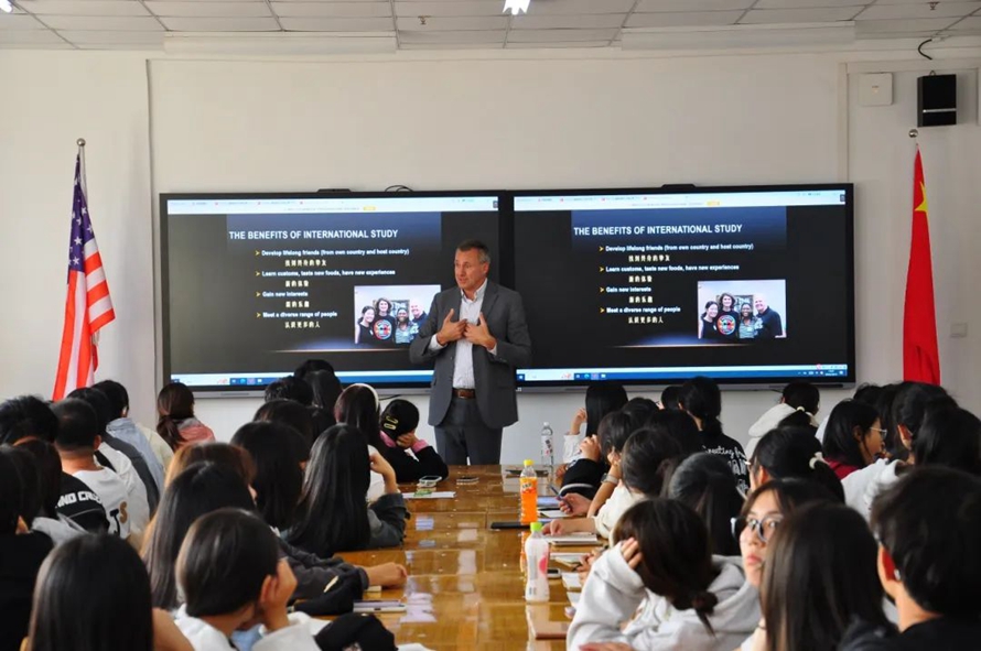 随后,柯林斯博士与凌雄辉先生召开美国哈町大学本升硕项目宣讲会,向河北外国语学院英语学院、国际商学院、国际金融学院、教师教育学院、国际语言教育学院等学院的师生介绍了两校合作项目及河外学子在哈町大学学习期间可选择的专业,具体有工商管理硕士、信息系统科学硕士和教育硕士。