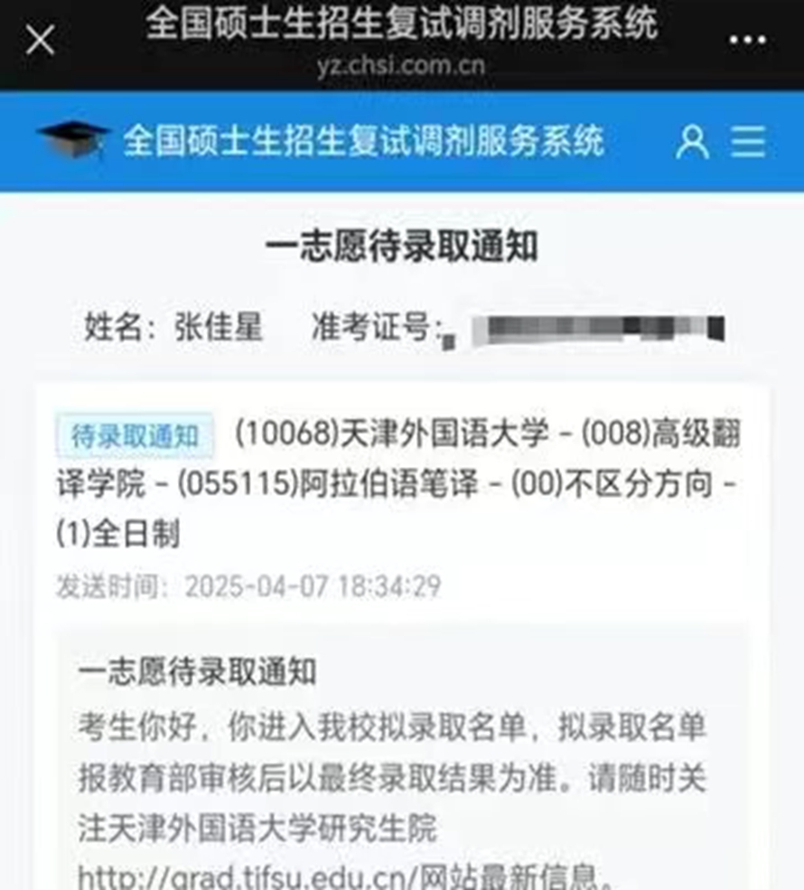 河北外国语学院2020级阿拉伯语本科班的张佳星。星光不负赶路人,时光不负有心人。在2025年考研中,成功考取天津外国语大学的阿拉伯语笔译方向硕士研究生。