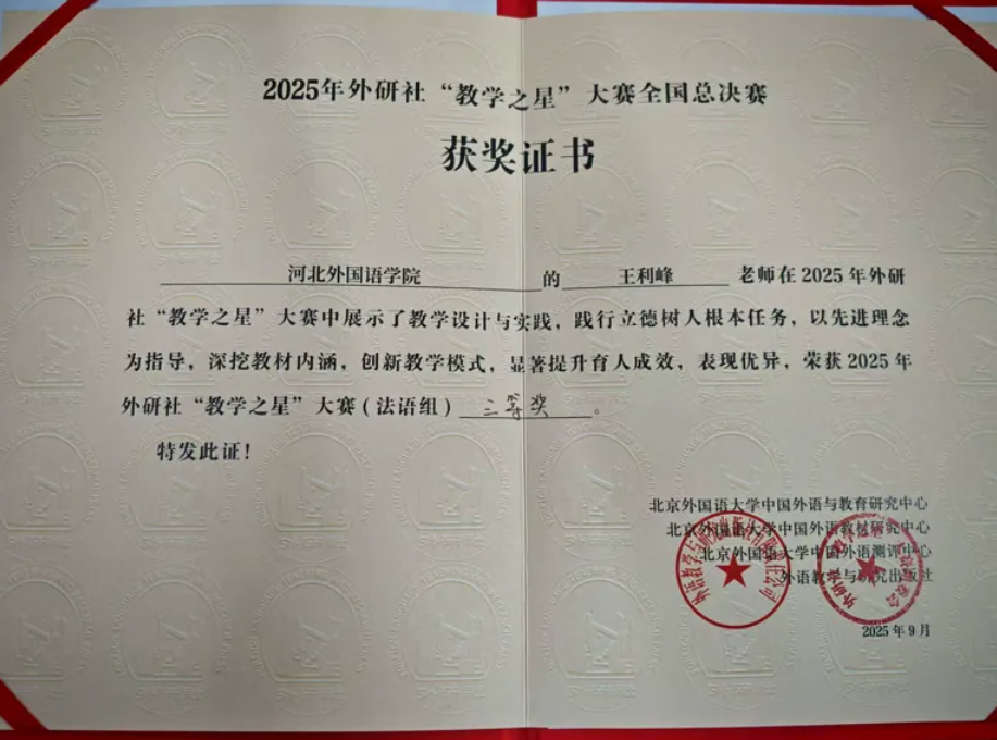 近日,2025 年外研社 “教学之星” 大赛法语组全国总决赛落下帷幕。河北外国语学院德法语言学院业务院长王利峰凭借扎实的专业功底与创新的教学设计,从全国晋级总决赛的 11 名优秀法语教师中脱颖而出,荣获全国三等奖,为学校赢得荣誉,也展现了河外法语教学的过硬实力。