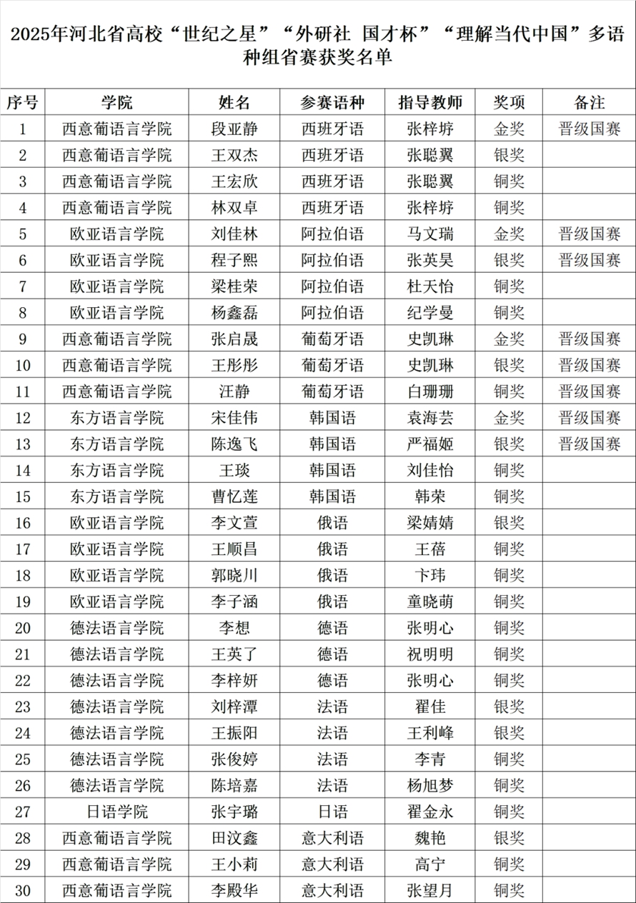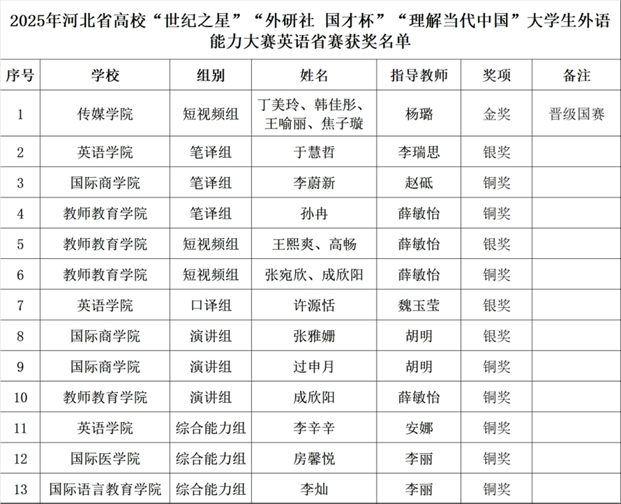 此次系列赛事的优异成绩,既是河北外国语学院外语学科建设与人才培养成果的集中展现,也为后续教育教学改革与竞赛备赛工作指明了方向。未来,河北外国语学院将继续深化外语教学改革,提升师生实践能力与创新意识,为培养具有国际视野的高素质人才不懈努力!