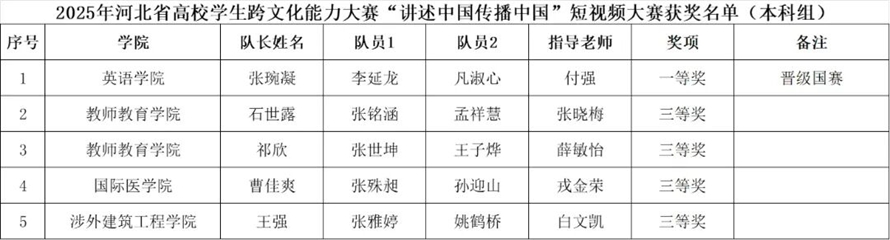 在河北省高校学生跨文化能力大赛“讲述中国 传播中国”短视频大赛中,共获1项一等奖、4项三等奖,1支队伍晋级国赛。