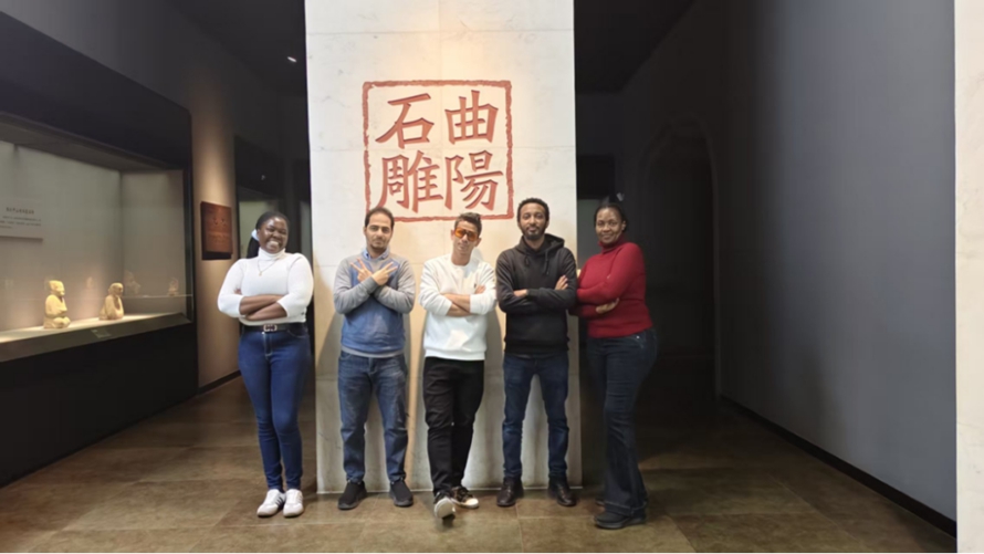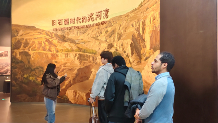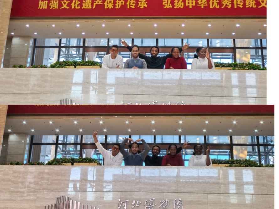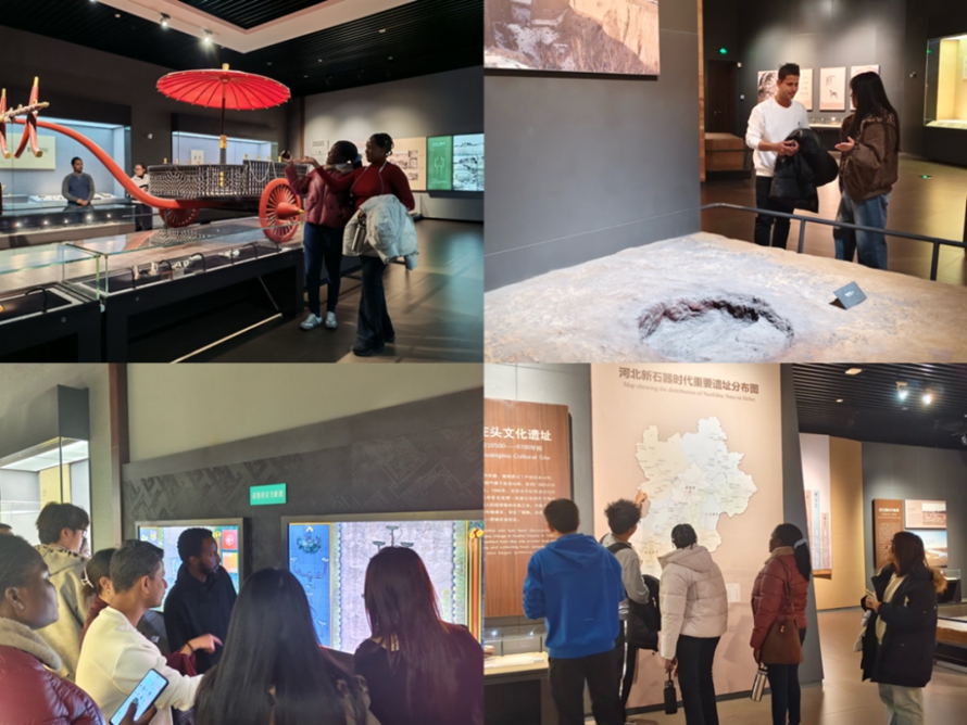 在“石器时代”展厅,学生甘甜指着打磨粗糙的石斧、陶片向外国教师解释:“这些是8000多年前先民的工具,他们用石头狩猎、制作陶器,这是河北文明的起点。”外教们蹲下身子,仔细观察石器上的纹路,有人用手指轻轻触摸展柜玻璃,仿佛在与远古先民“对话”。来自孟加拉的外教Rion 感叹:“在西方,我们常认为文明的起点在两河流域,但在这里看到的文物证明,中国北方的文明同样悠久,这种跨越时空的共鸣太神奇了。”来自埃塞俄比亚的外教Negash 激动地补充:“在欧洲,我们常认为人类文明起源于非洲和近东,但这里告诉我们,东亚同样是人类演化的重要舞台。”