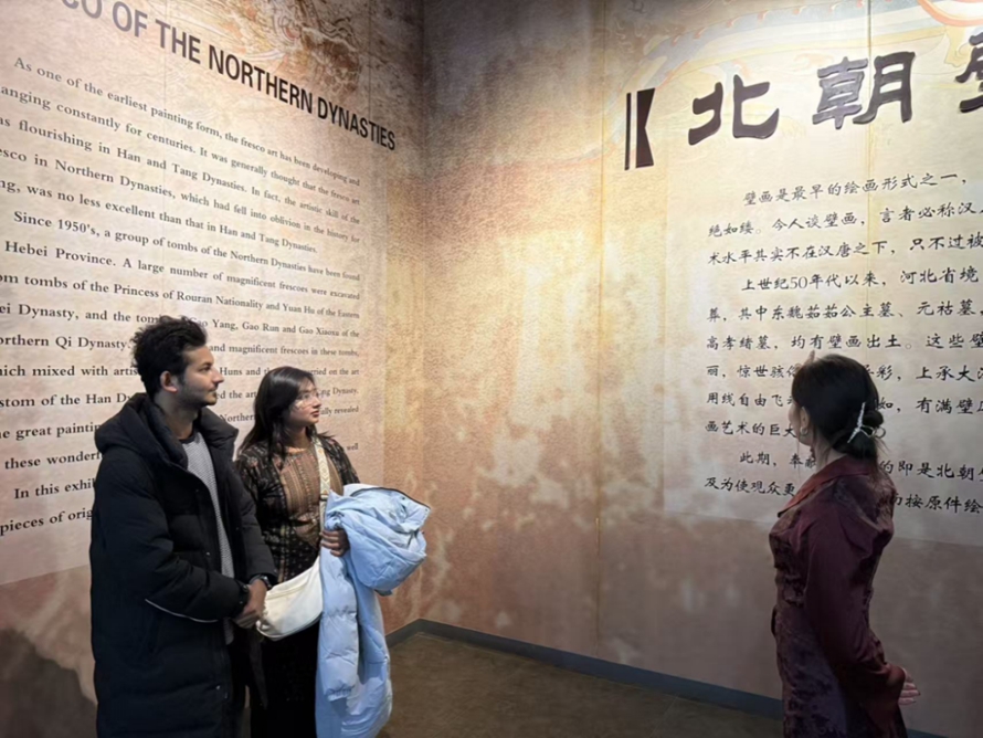 在“北朝壁画”展厅,一幅幅色彩依旧鲜艳的墓室壁画,将1500年前的社会生活鲜活呈现。学生德吉布毛介绍:“这些壁画出土于河北境内多座北朝贵族墓葬,内容涵盖仪仗、狩猎、宴饮等。”外教们则从艺术风格角度分析:“这些壁画的线条和色彩运用,与西方中世纪壁画有相似之处,但又有着东方特有的灵动,这或许是古代中外艺术交流的痕迹。”“这些画作的色彩至今鲜艳,人物神态生动,连马匹的肌肉线条都清晰可见,”来自肯尼亚的外教Carol惊叹道,“这不仅是绘画,更是社会学的珍贵档案。”当得知这些壁画多出土于河北境内的东魏、北齐墓葬时,外教们纷纷表示:“我们曾在书本上读过中国历史,但今天,我们‘看见’了历史。”