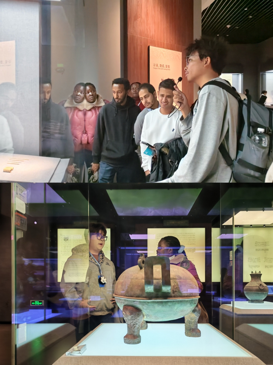 走进“战国雄风”展厅,青铜器的冷光映照出一个被历史低估的强国——中山国。当看到战国时期的青铜战车模型时,来自埃塞俄比亚的外教Jaefer说:“西方有古罗马军团,东方有战国战车,这种古代军事文明的对比太有趣了,我想把这些故事讲给我的学生听。”来自埃塞俄比亚的外教Negash 站在“错金银四龙四凤铜方案”前,听到学生讲解其可拆卸、可折叠的设计时,不禁脱口而出:“This is ancient IKEA!(这是古代的宜家!)”引得众人会心一笑。“他们的军事、政治、工艺都达到了极高水平,”他说,“这让我重新思考‘文明’的定义——强大不只在于疆域,更在于智慧与韧性。”