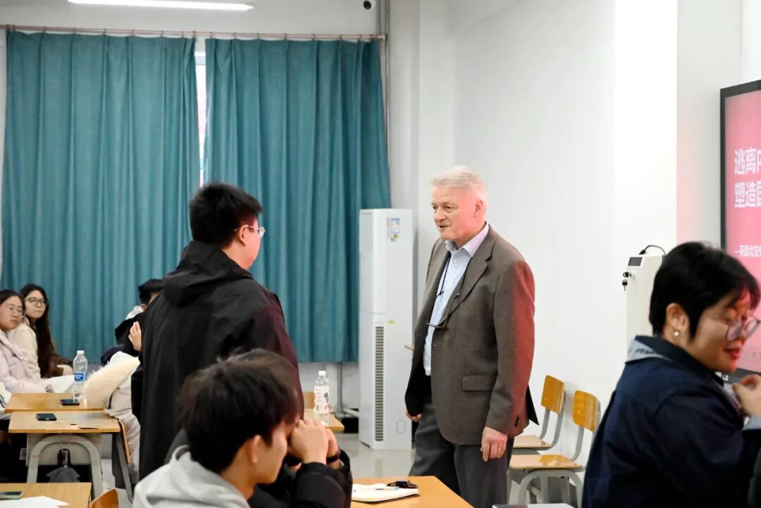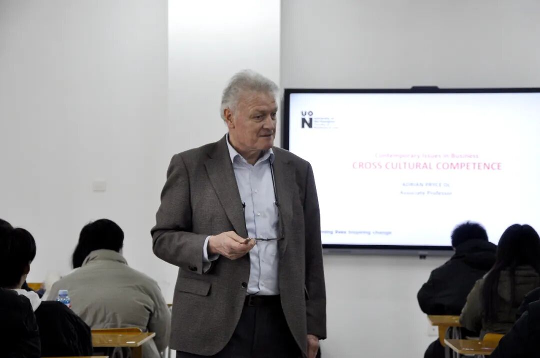 签约仪式后,艾德里安·普赖斯·霍德华教授与于丽娟主任结合自身研究领域,为河北外国语学院师生带来了一场题为《国际商务中的跨文化交流》的专题讲座,赢得现场师生热烈反响。讲座中,艾德里安·普赖斯·霍德华教授以"future"一词为切入点,巧妙拆解为Fast、Urban等六个维度,结合生活实例、文化理论及中英数据对比,深入浅出解析东西方文化差异及跨文化沟通技巧。于丽娟主任则聚焦中外学生学习特点与成长需求,详细介绍了北安普顿大学留学生支持体系,为在场学生提供了宝贵的国际化学习参考。