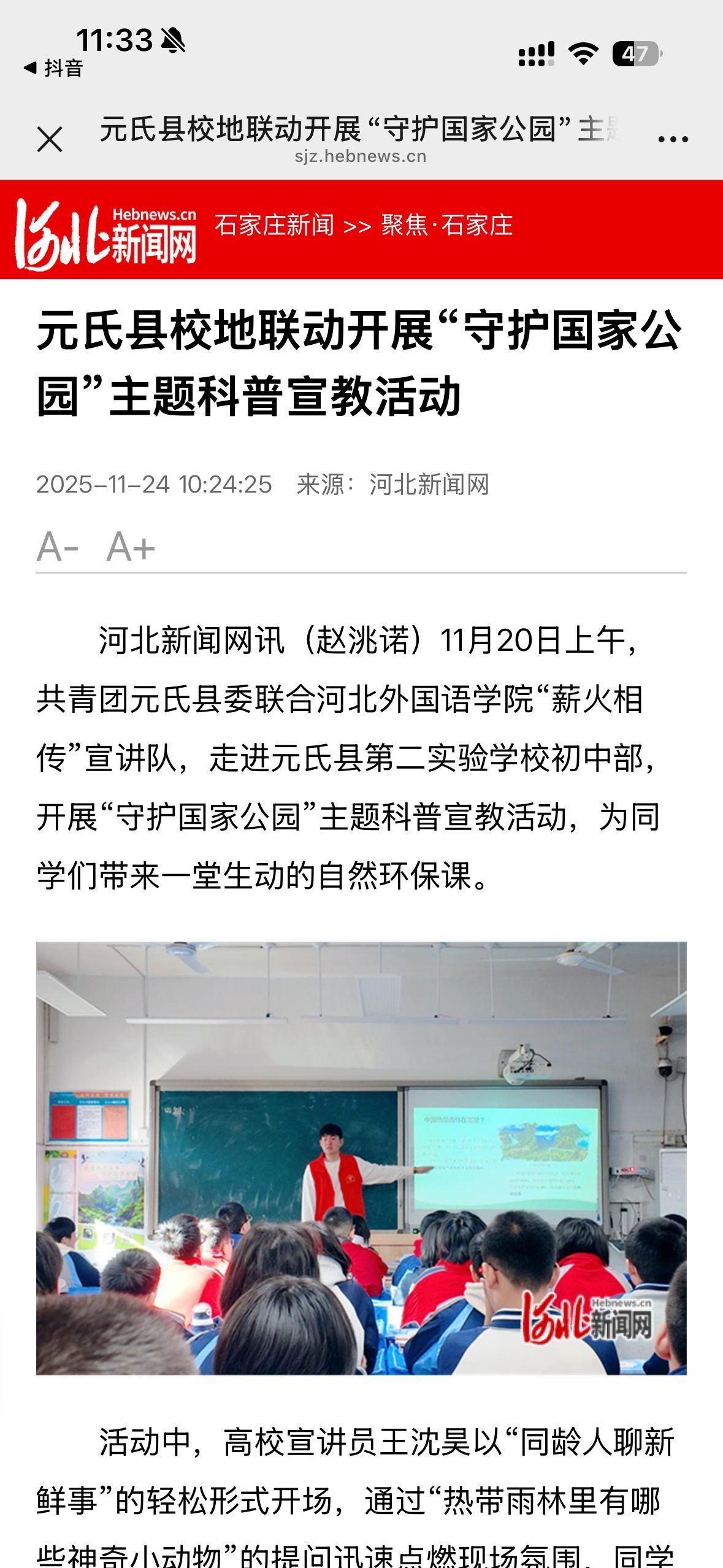 元氏县校地联动开展“守护国家公园”主题科普宣教活动