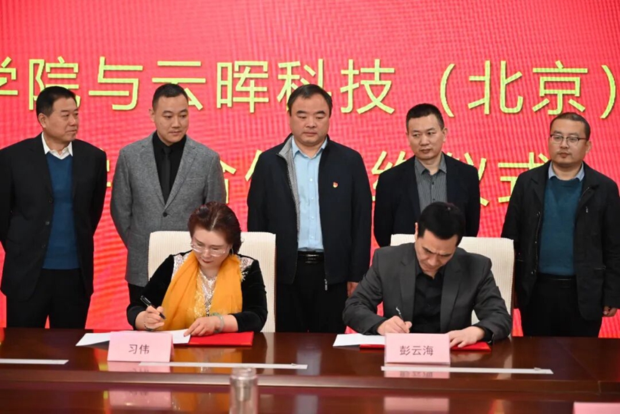 学校副董事长、执行校长习伟教授与云晖科技(北京)有限公司总经理彭云海共同签署《产学研合作协议》。