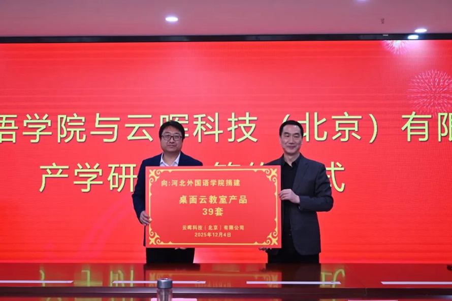 在双方友好合作的基础上,彭云海总经理代表云晖科技(北京)有限公司向河北外国语学院捐赠了“39套桌面云教育器材”,他表示:“期待从河外课堂走出来的学生,能成为我们的‘技术合伙人’。”习伟校长表示:“希望云晖的项目,能成为学生的‘实践练兵场’。”两句肺腑之言,道尽了“双向共赢”的期待。