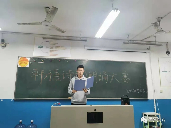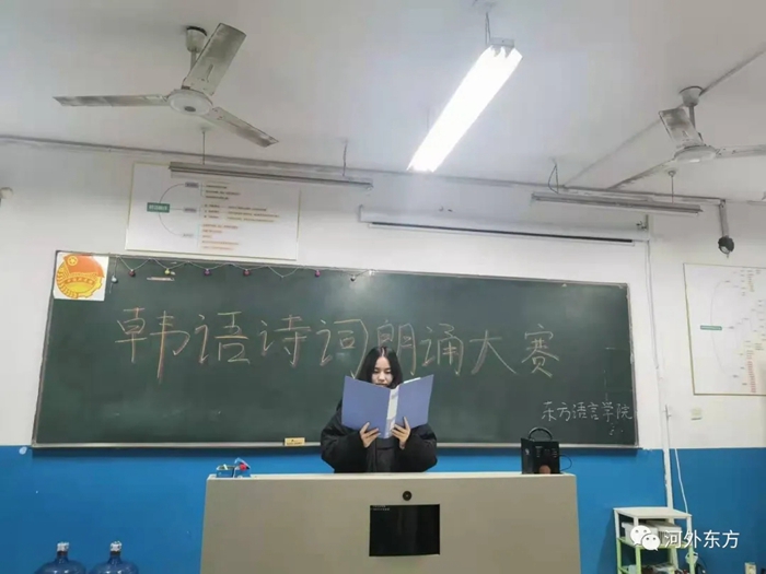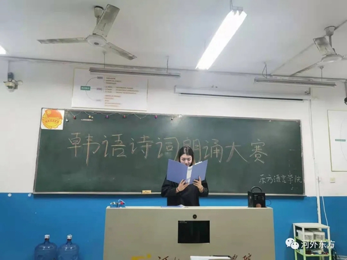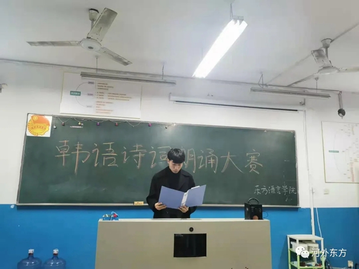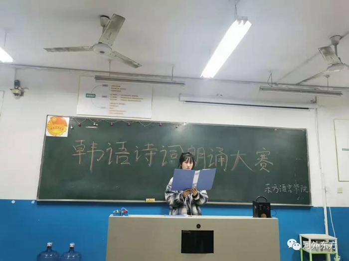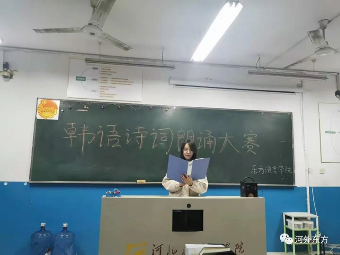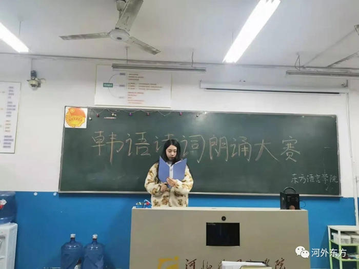 2020年11月23日东方语言学院举办了一场韩语诗词朗读大赛。该比赛在河北外国语学院西楼418学生活动中心举办,参加此次活动的是东方语言学院全体学生。
